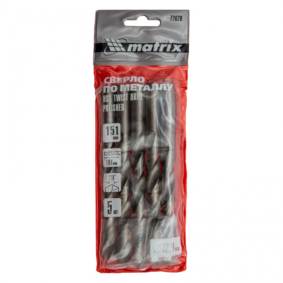 Полированное сверло по металлу Matrix 72020 из стали HSS, с цилиндрическим хвостовиком, 5 шт. в упаковке, используется для получения отверстий диаметром 12 мм. Угол заточки составляет 118 градусов, поэтому сверло оптимально для работы с черными металлами, сталью, чугуном и твердой бронзой.