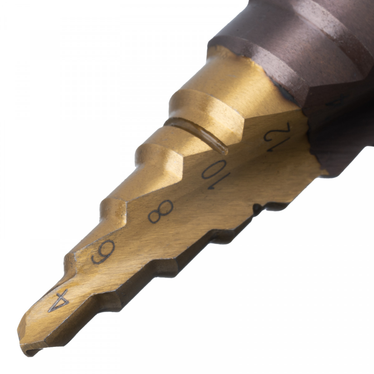 Сверло ступенчатое, 4-6-8-10-12-14-16-18-20-22-24-26-28-30-32 мм, Р6М5К5, 6-гр. хвостовик Denzel
