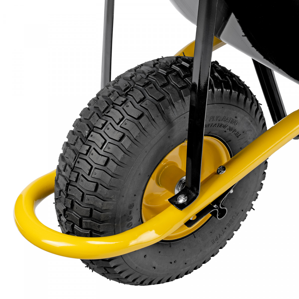• Устойчивость — тачка не проваливается в грунт благодаря широкому пневмоколесу и подпятникам на ножках.