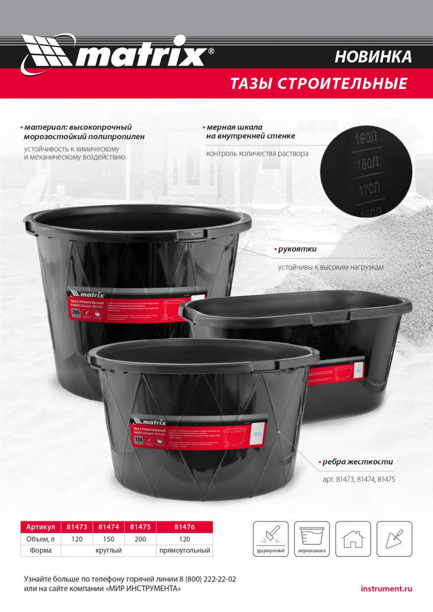 Прямоугольный строительный ударопрочный таз Matrix 81476 объемом 120 л универсален в применении: он используется для перемешивания строительных смесей, хранения сыпучих материалов и воды для технических нужд. Будет полезен во время проведения строительно-отделочных работ, пригодится также в подсобном хозяйстве и на огороде.