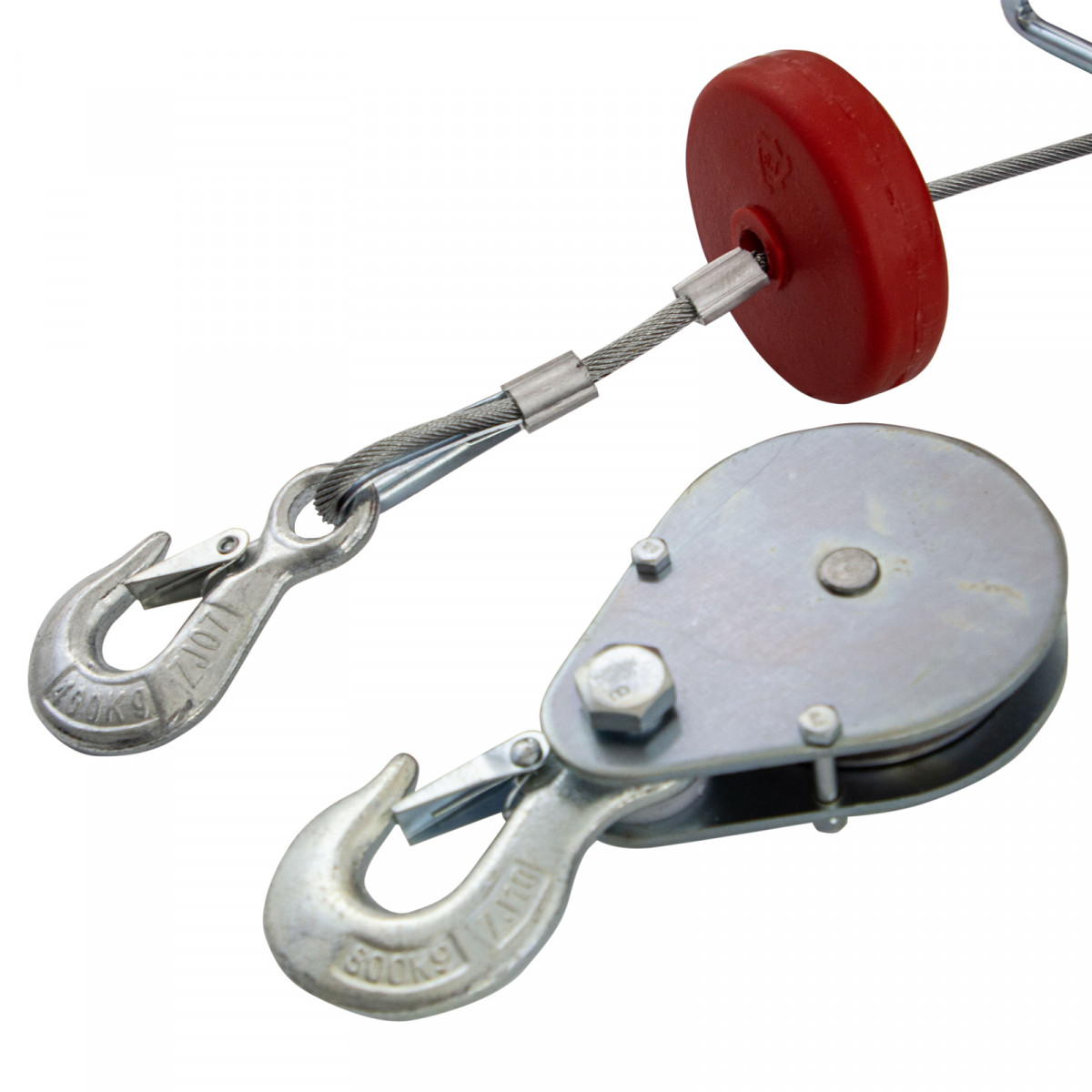 Электрический тельфер Denzel TF-800 52014 мощностью 1300 Вт способен поднимать автомобильные двигатели, строительные материалы и другие грузы массой до 0,4 т напрямую и до 0,8 т с помощью блока полиспаста. Высота подъема составляет 6 м при использовании полиспаста и 12 м без него, скорость — 4 и 8 м/мин соответственно. Устройство пригодится в гараже, автомастерской или на строительной площадке. Полиспаст входит в комплект поставки.