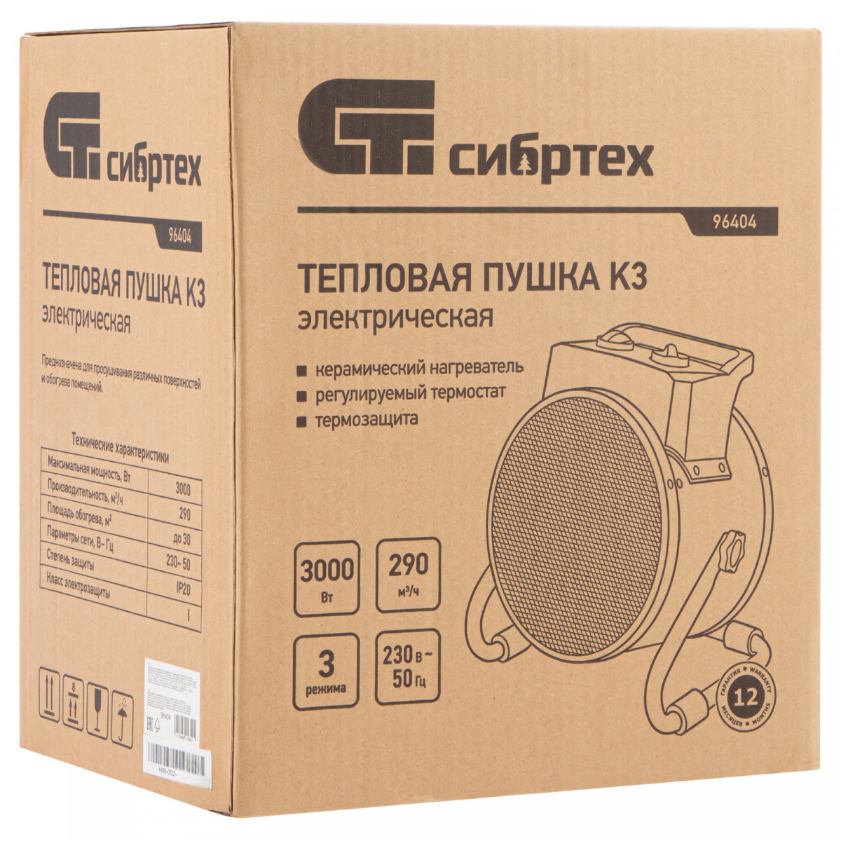Тепловая пушка, керамический нагреватель K3, 3 режима, 230В, 1500/3000 Вт Сибртех