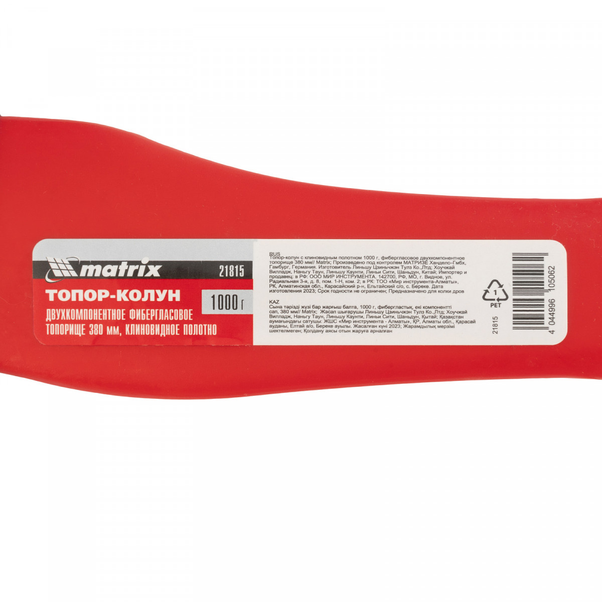 Топор-колун Matrix 21815 с клиновидным полотном весом 1000 г и фибергласовым двухкомпонентным топорищем длиной 380 мм используется для работы с древесиной. Позволяет как рубить, так и колоть материалы. Рабочее полотно утолщено с обеих сторон, поэтому легко раскалывает древесину.