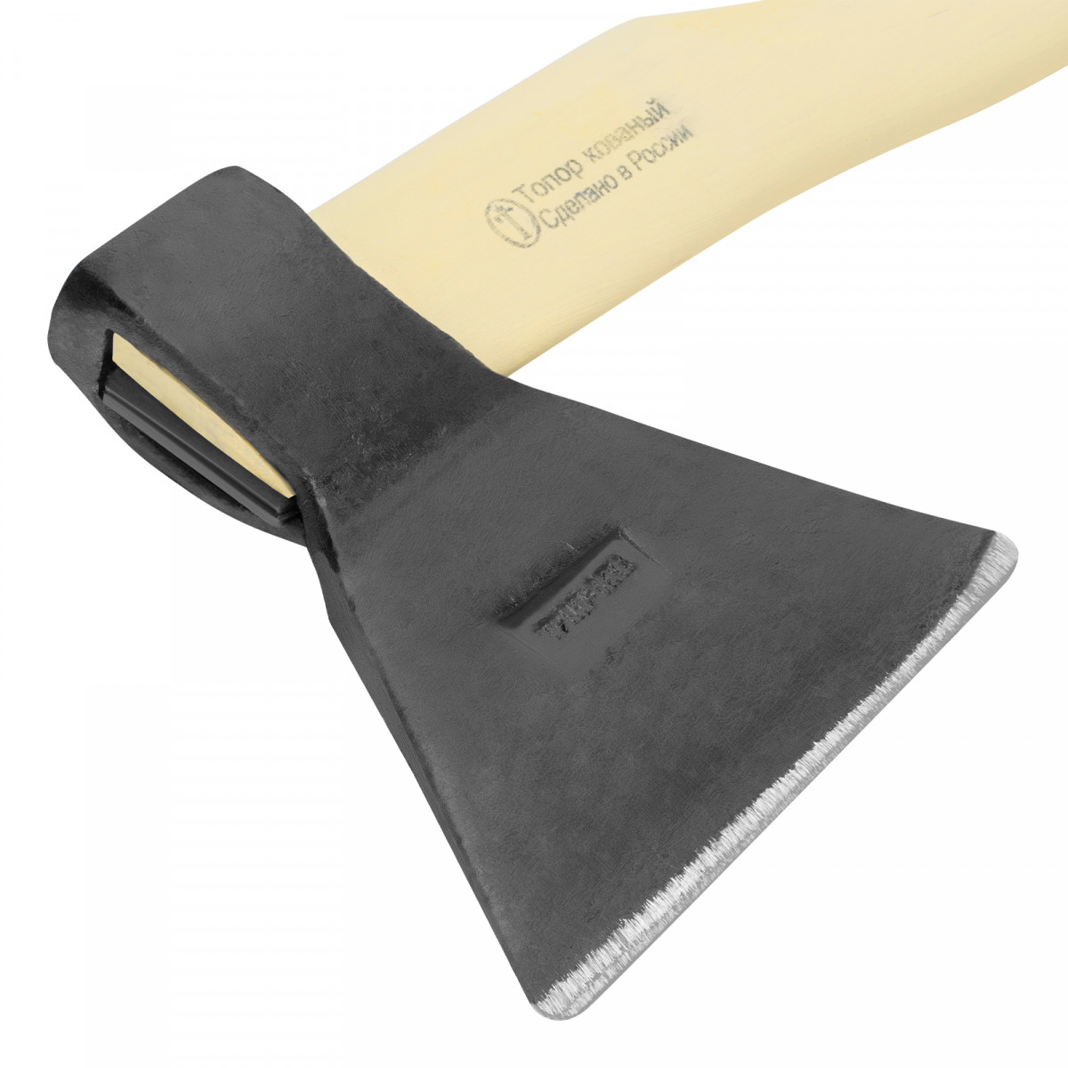 - Устойчивость к разрушению — березовое топорище отшлифовано, покрыто шпатлевкой и пленкой.