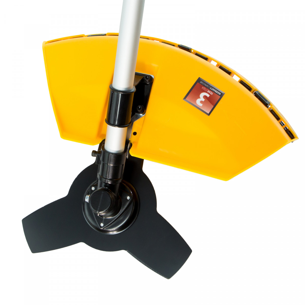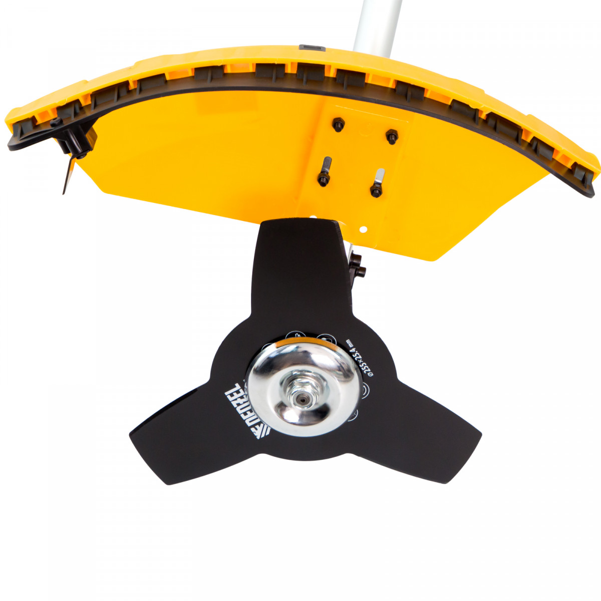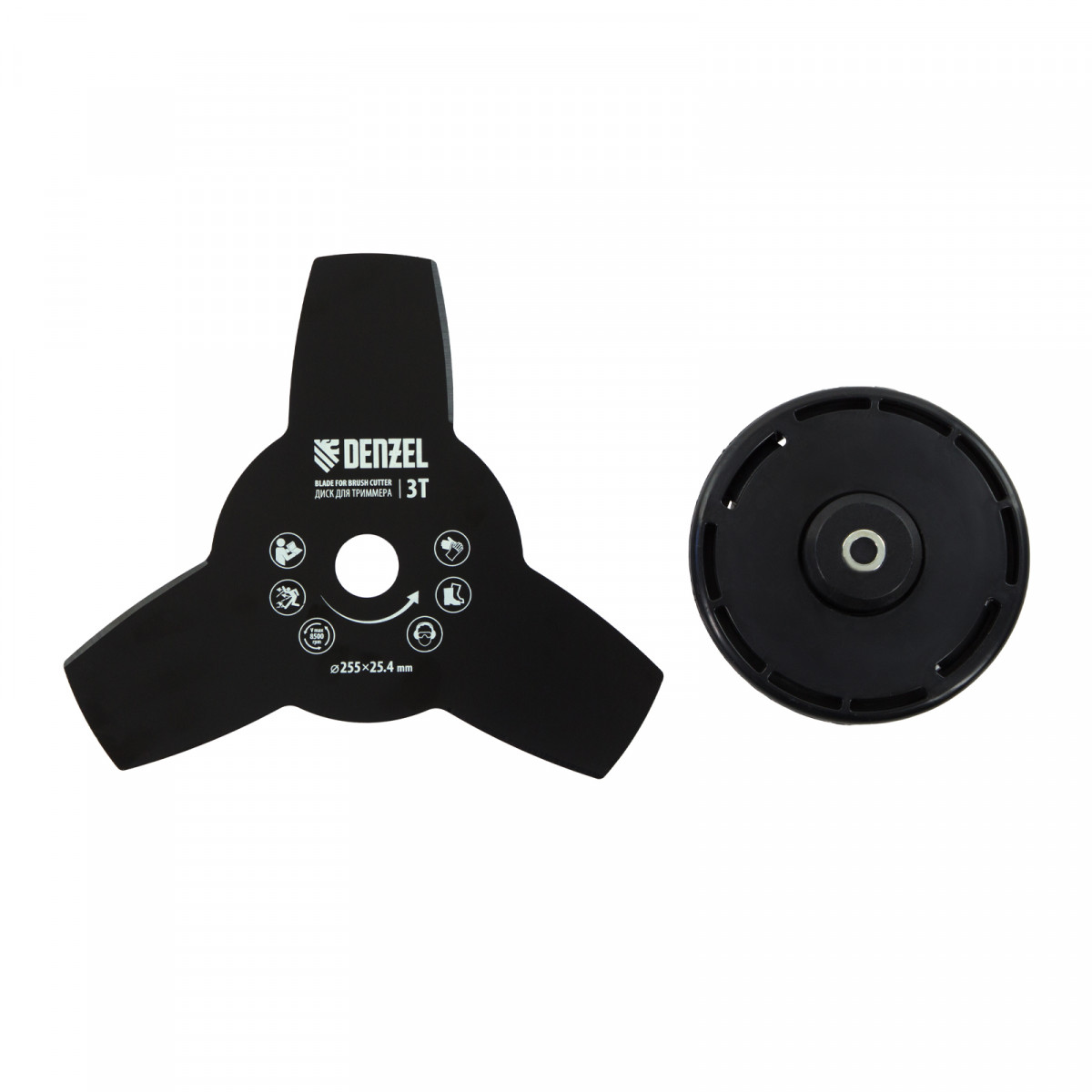 - Дополнительные возможности — можно приобрести диск Denzel 96323 с шириной скашивания 230 мм для быстрого удаления растительности с жесткими стеблями, 96328 для скашивания молодых побегов кустарника диаметром до 3 мм, 96340 для срезания борщевика, кустарника и молодых побегов деревьев с диаметром стволов до 10 мм.