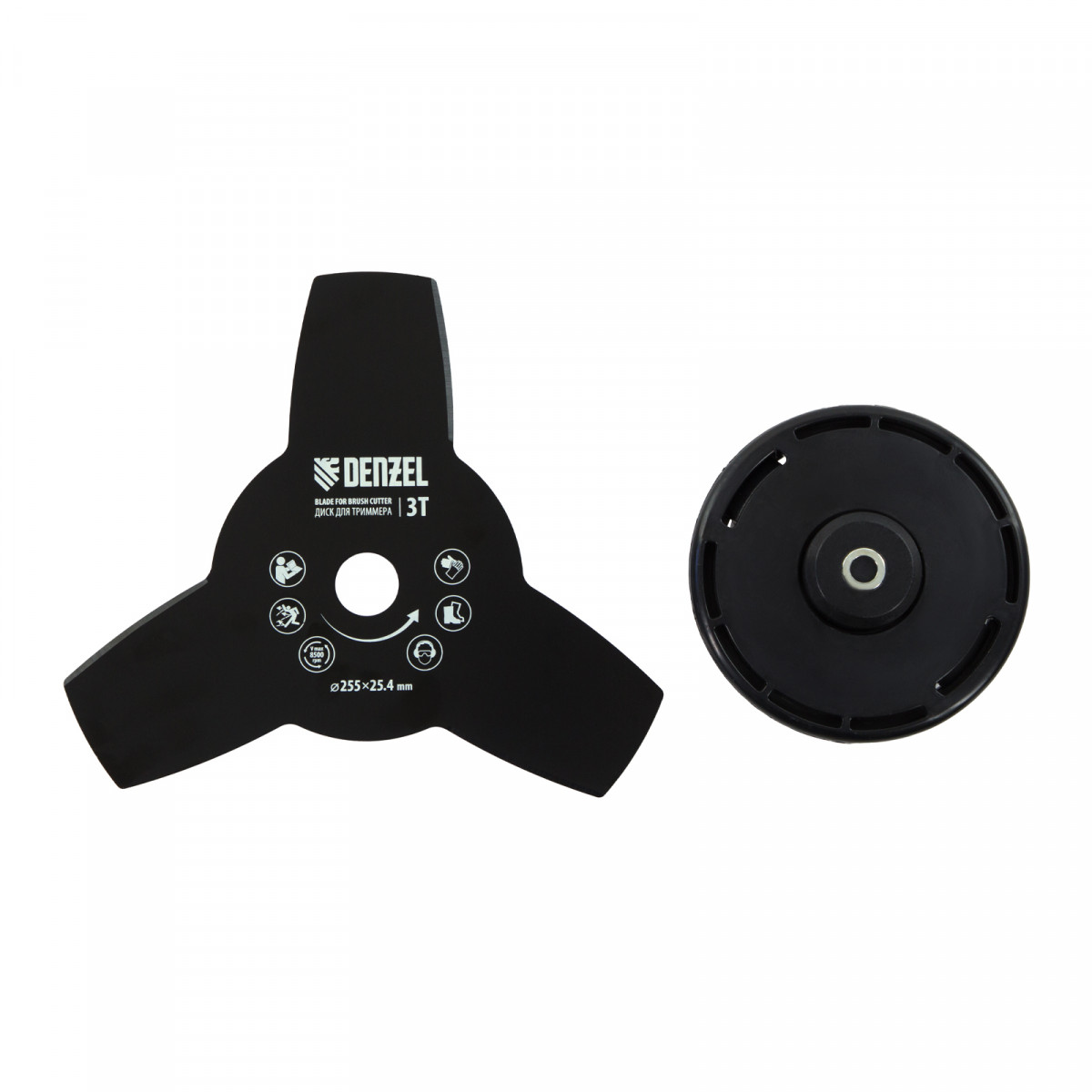 - Дополнительные возможности — можно приобрести диск Denzel 96323 с шириной скашивания 230 мм для быстрого удаления растительности с жесткими стеблями, 96328 для скашивания молодых побегов кустарника диаметром до 3 мм, 96340 для срезания борщевика, кустарника и молодых побегов деревьев с диаметром стволов до 10 мм.