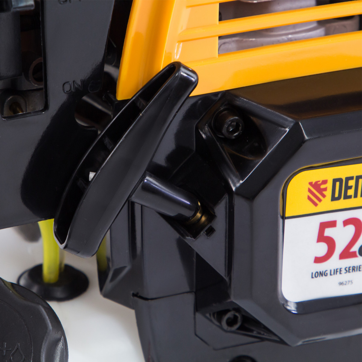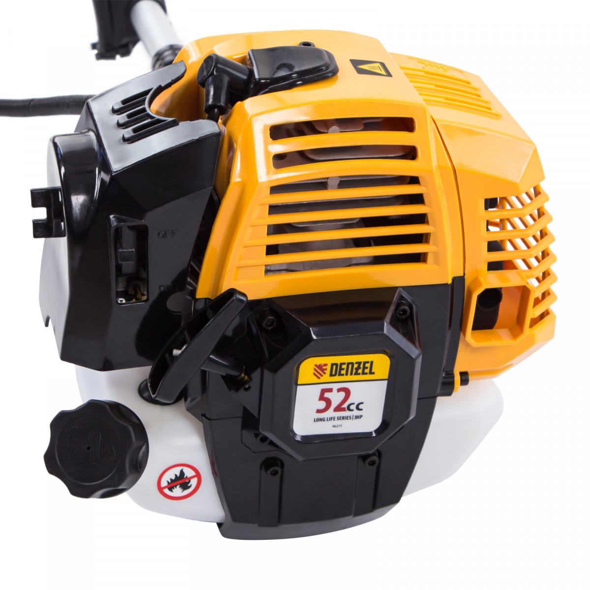 Бензиновый триммер Denzel DR-52 96275 с двигателем объемом 52 см3 и неразъемной штангой состоит из 2 частей и предназначен для ухода за газоном и формирования у него ровных границ, скашивания травы различных типов, в том числе с жесткими стеблями (полынь, крапива, лебеда). Эффективное решение этих задач обеспечивают режущие насадки — трехлопастный нож из стали и усиленная катушка из полиамида с леской. Они вращаются со скоростью 9500 об/мин, ширина скашивания составляет 25,5 и 42 см. Данная модель является самой производительной из линейки DR. Двигатель мощностью 3 л.с. обеспечивает уверенную работу даже на сложном рельефе.