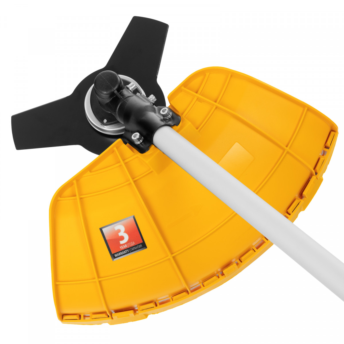 • Безопасная эксплуатация — прочный кожух, закрывающий оснастку, защищает пользователя от летящей травы, грязи и мелких камней.