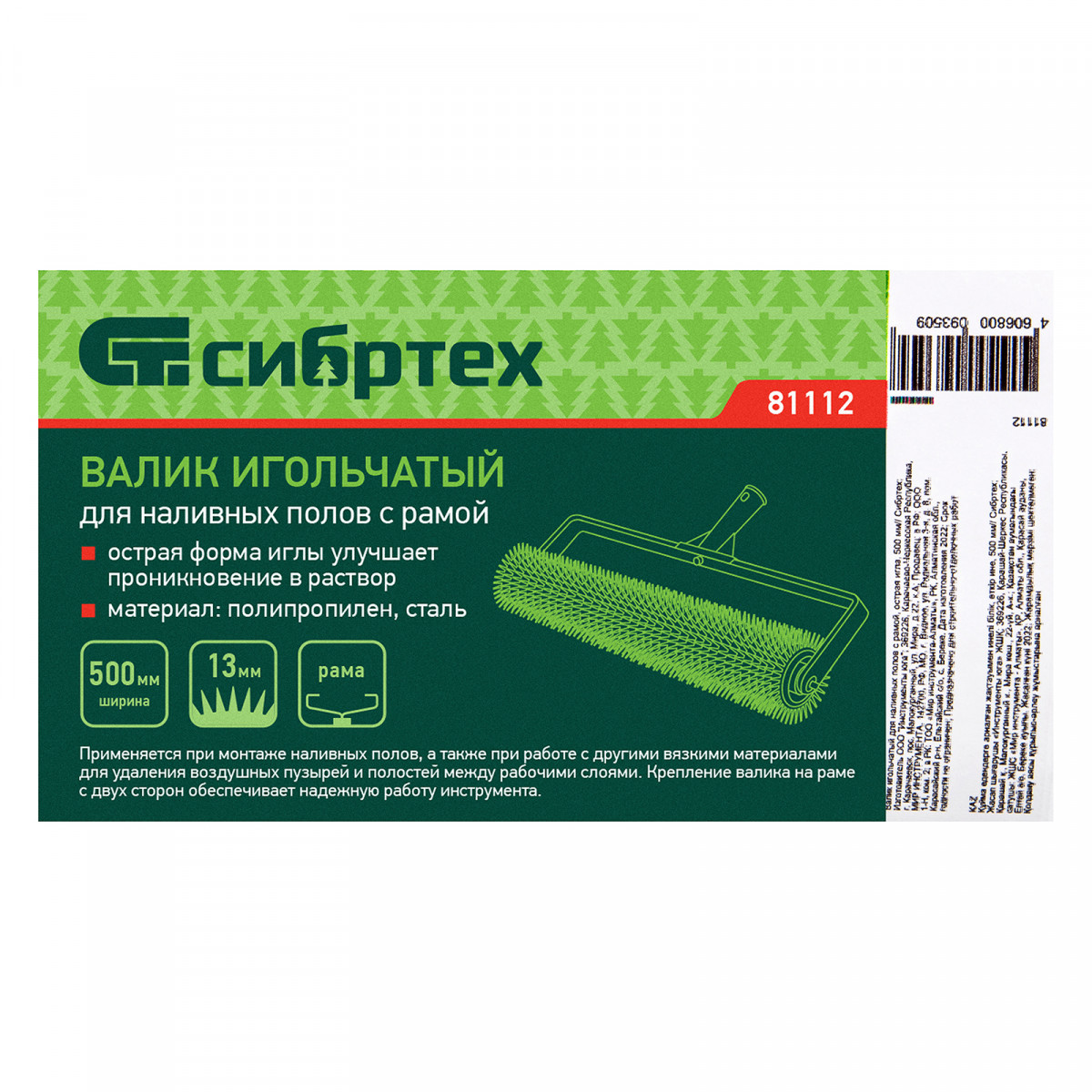 Валик игольчатый Сибртех 81110 с ручкой, длина 240 мм, применяется при монтаже наливных полов, а также при работе с другими вязкими материалами для удаления воздушных пузырей и полостей между рабочими слоями. Благодаря ширине 500 мм валик можно использовать на поверхности большой площади. Иголки длиной 14 мм подходят для покрытий небольшой толщины.
