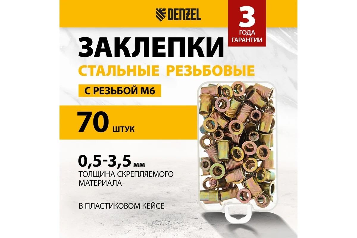 Заклепки резьбовые стальные оцинкованные М6 пластиковый кейс 70 шт Denzel
