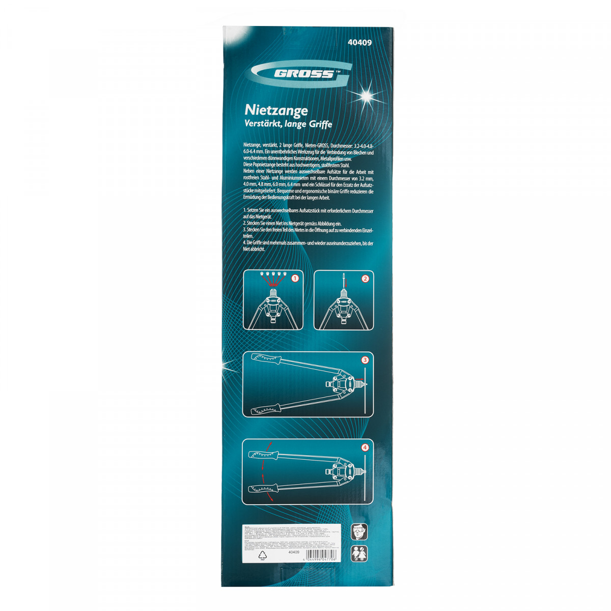 Двуручный усиленный заклепочник Gross 40409 длиной 520 мм, с удлиненными рукоятками, предназначен для соединения листовых заготовок, металлопрофиля, легких строительных конструкций и плоских деталей при помощи алюминиевых или стальных (в том числе из нержавеющей стали) заклепок размером 3,2-4,0-4,8-6,0-6,4 мм, для которых предусмотрены сменные насадки соответствующих размеров. Благодаря удлиненным рукояткам процесс клепки требует меньше усилий, чем при применении обычного инструмента. Заклепочник используется при проведении строительных и ремонтных работ, в производстве мебели, бытовой и оргтехники, а также при ремонте автомобилей.