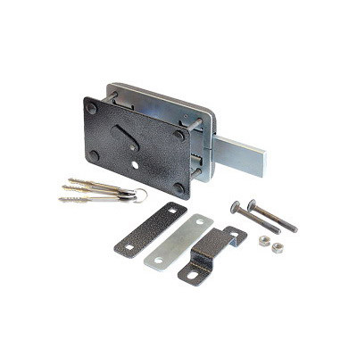 Замок накладной, цилиндровый под крест.ключ, для установки на металлические двери. Засов из прямоугольного ригеля размерами (ширина-высота) 12-40 мм, с максимальным вылетом 75 мм. Удаление ключевого отверстия - 90 мм. Габариты замка -255x110x85. Комплектация - 3 крестовых ключа, ответная планка, внешняя накладка, закрывающая весь корпус замка. Замок односторонний - ключевое отверстие только с внешней стороны.