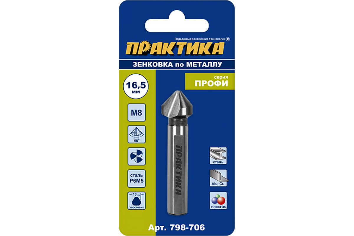 Зенковка по металлу 16.5x60 мм, 90 град., под резьбу М8 ПРАКТИКА 798-706 предназначена для снятия фаски по краю отверстия или формирования конического углубления под потайные головки крепежных элементов в стали с пределом прочности до 900 Н/мм2, сером чугуне, цветных металлах и твердом пластике. Изготовлена из быстрорежущей стали Р6М5 с поверхностным упрочнением режущей кромки.